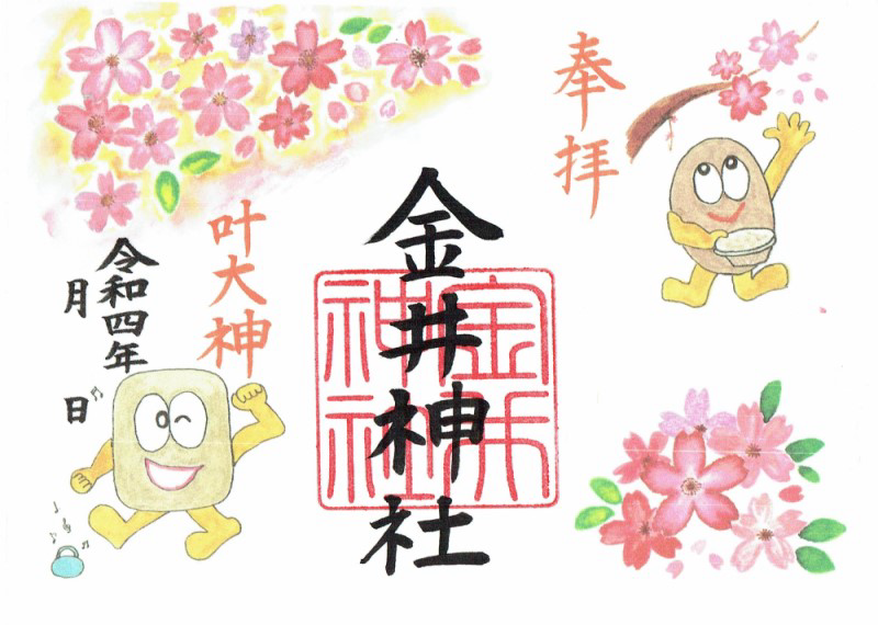 令和四年の金井神社の桜御朱印です。レアな御朱印です。金井神社では境内の5本の桜の大木が美しい花を咲かせます。桜の期間中は、夜間に灯籠の明かりが灯されます。是非、金井神社の桜をご鑑賞下さい。御朱印は、社務所前の用紙にてお申し込み下さい。まもなく郵送されます。