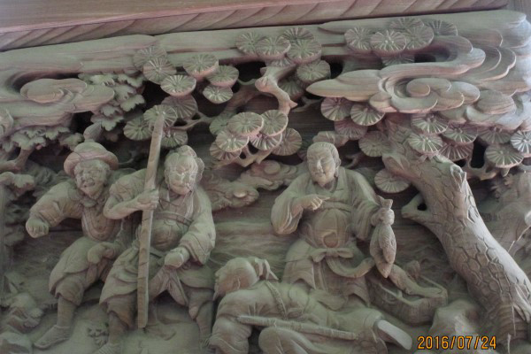 - 金井神社の御本殿には卓抜な彫刻が施されており、下野市の文化財に指定されています。随所に彫られた多数の龍や鶏や唐獅子などの他に、本殿周囲の三面の壁には古代中国と日本の歴史上の名場面が彫られています。
